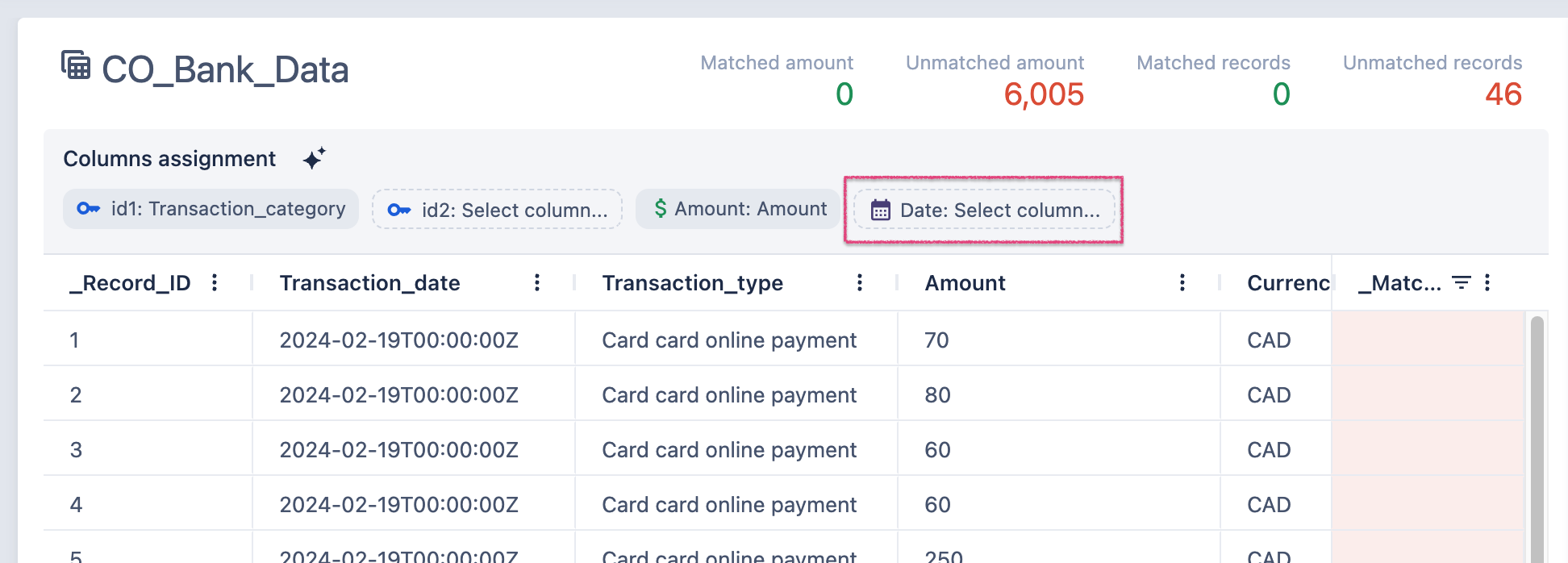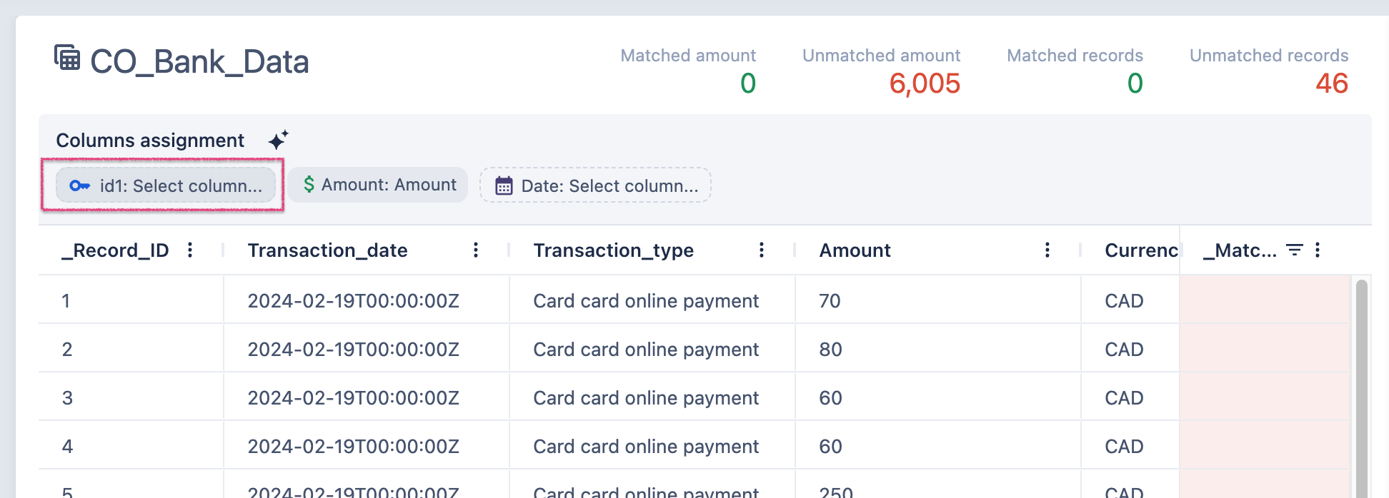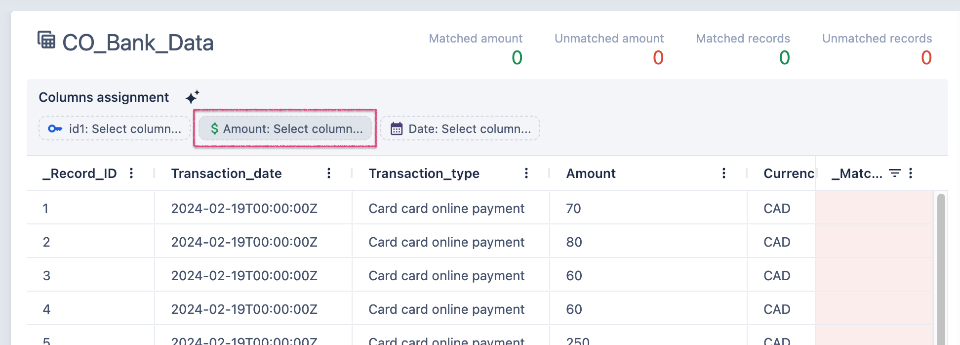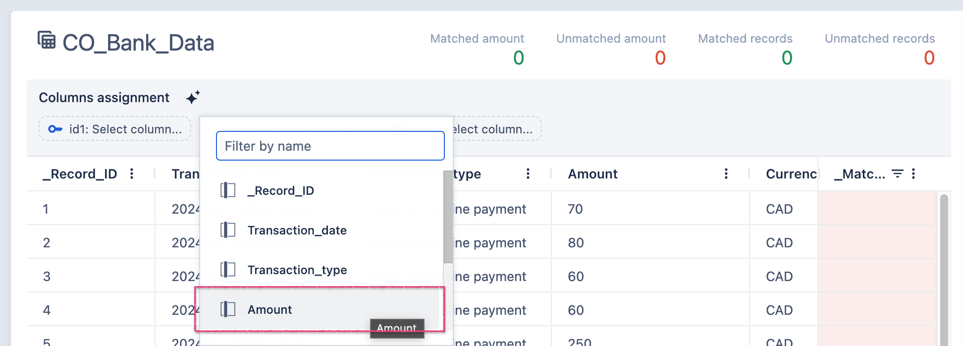 3. Assign columns that represent Amount. This columns will be used to compare found amounts and report on how much unmatched and matched amount was found.