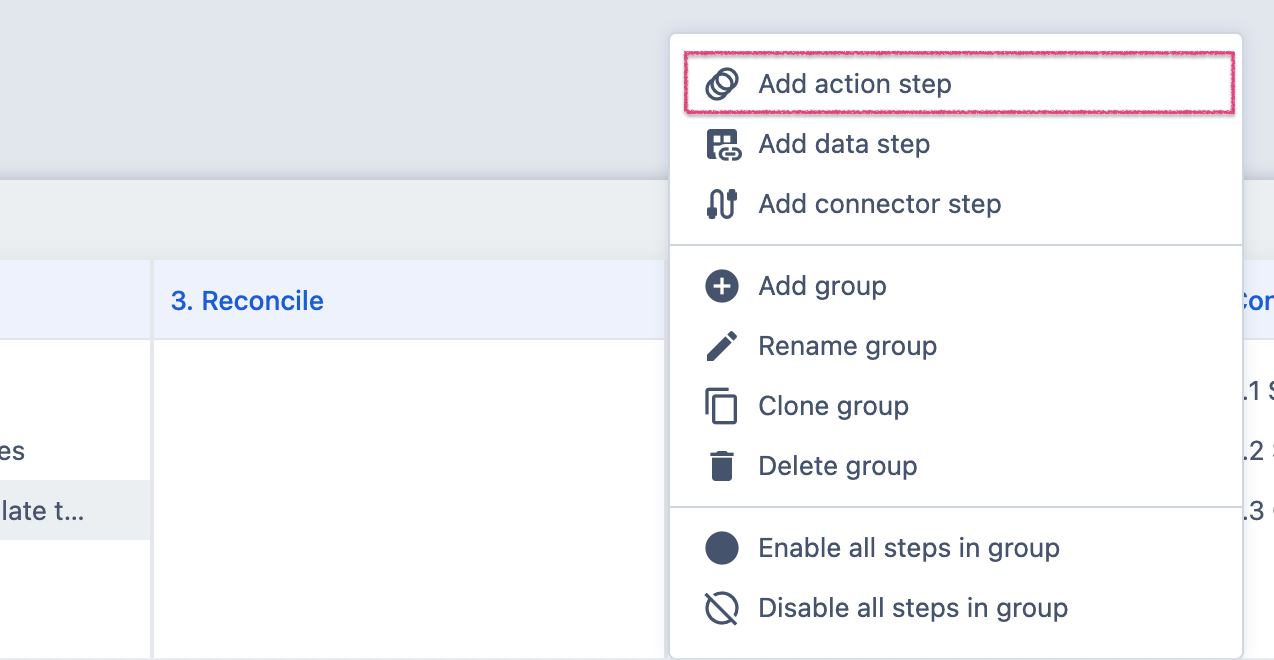 1. Create a new action step in your process. Choose Add action step option in the group menu.