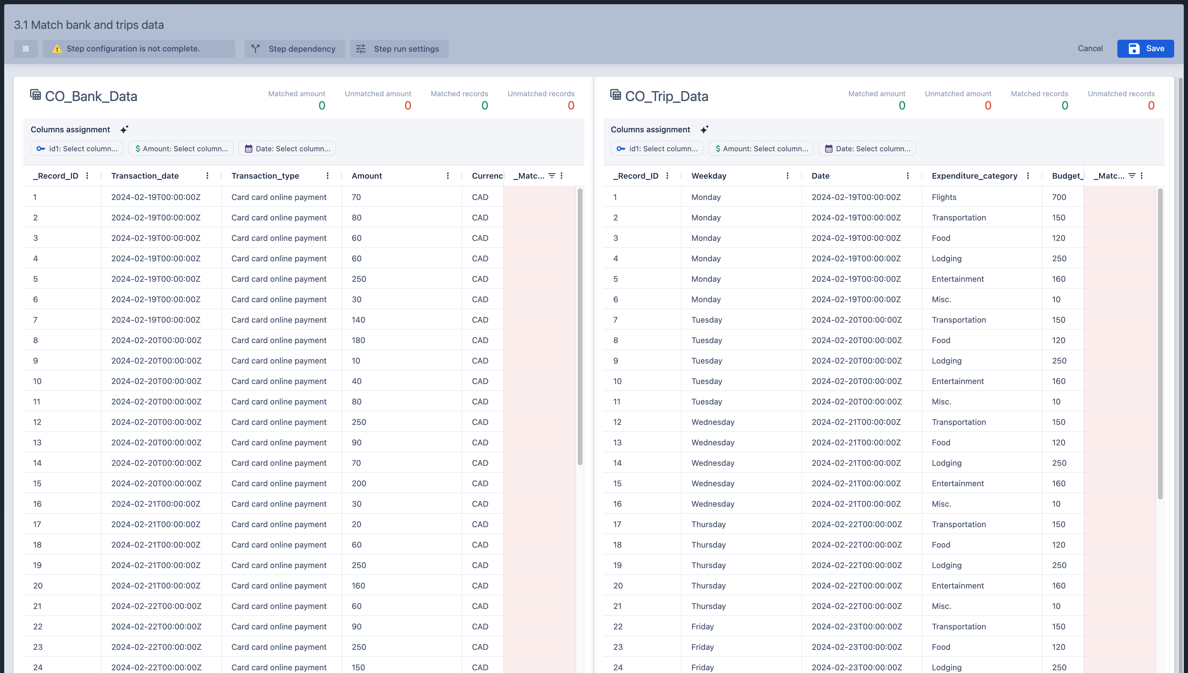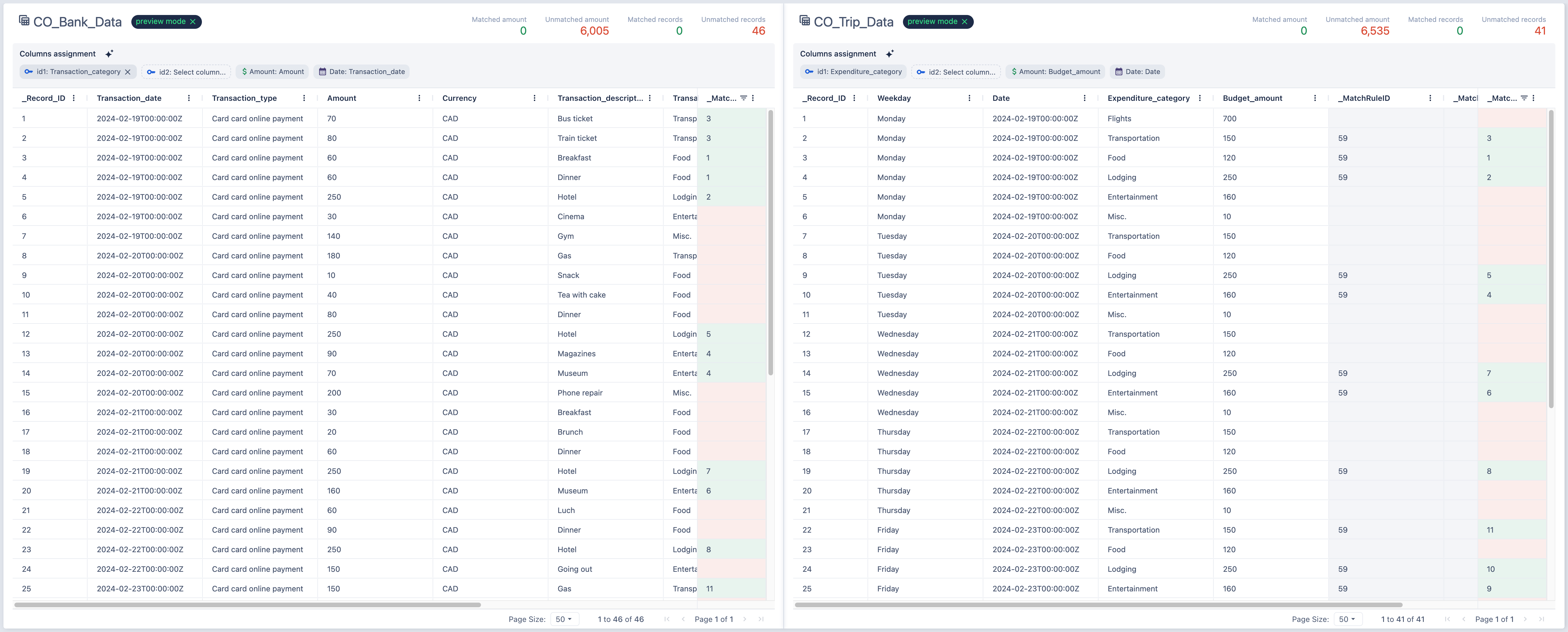After you select two tables the step will display them and data in them in a grid format. The grid allows you to view data in tables, sort and filter data by MatchID (matched/unmatched only).