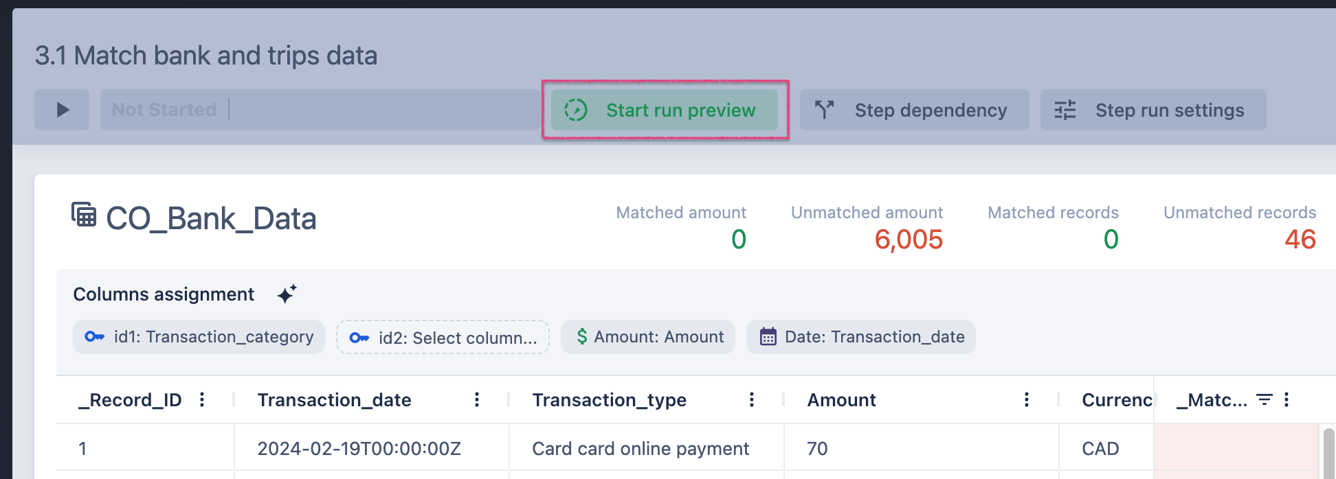 Preview will give you matches as if you ran the step but it does not write anything to tables yet. To preview the data click Start run preview button.