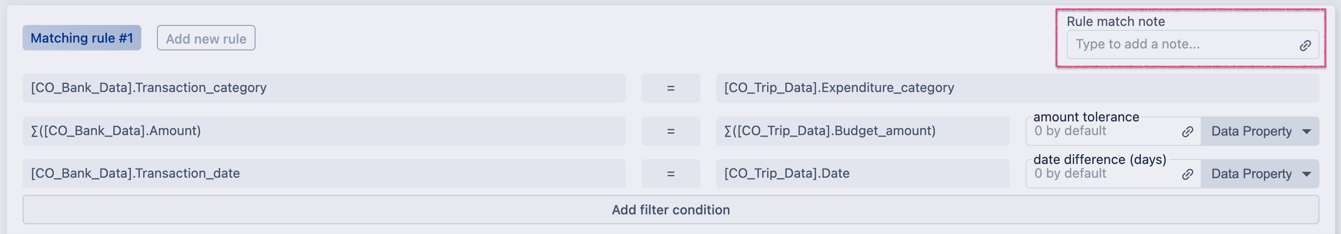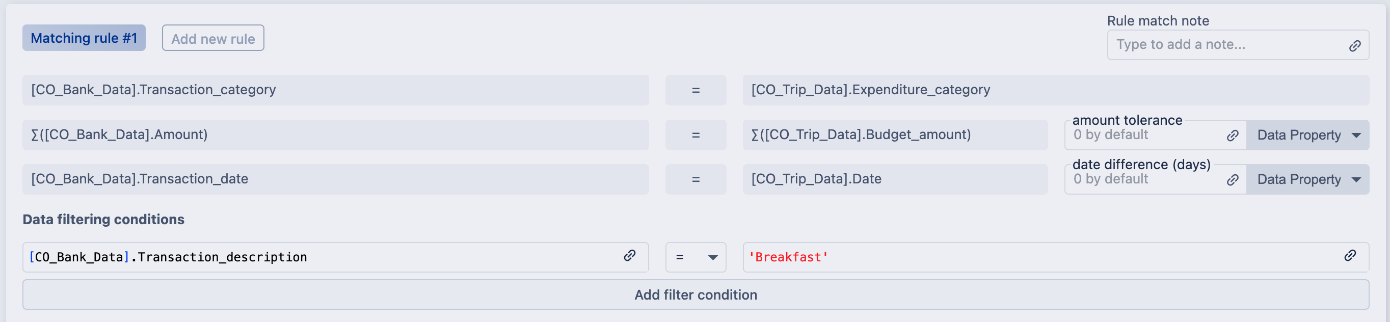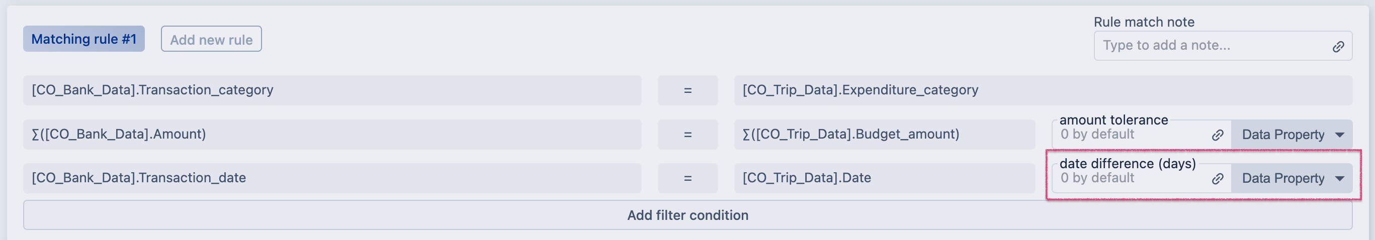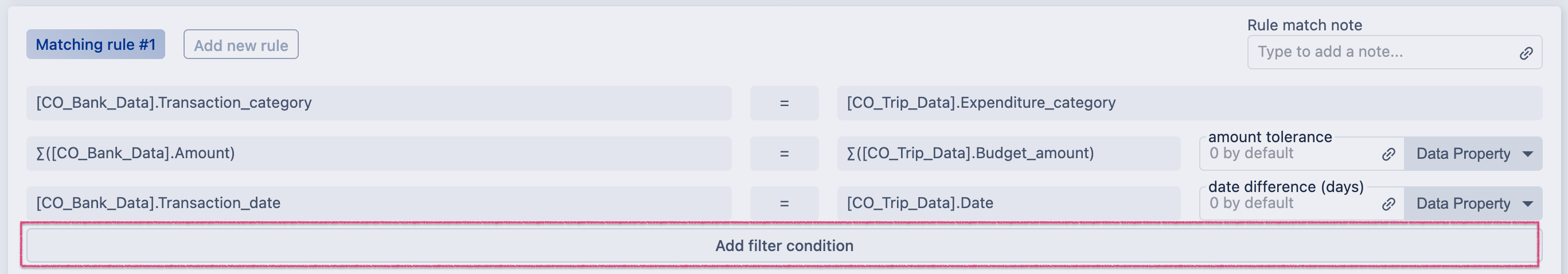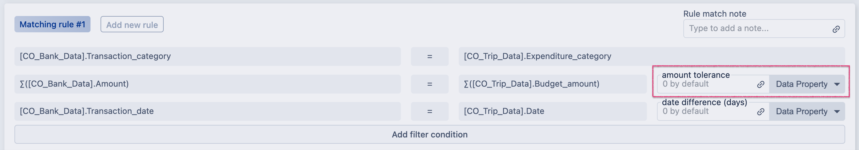 4. You can specify additional data filtering conditions if you want the matching rules to work on a specific set of data. To do that click Add filter condition